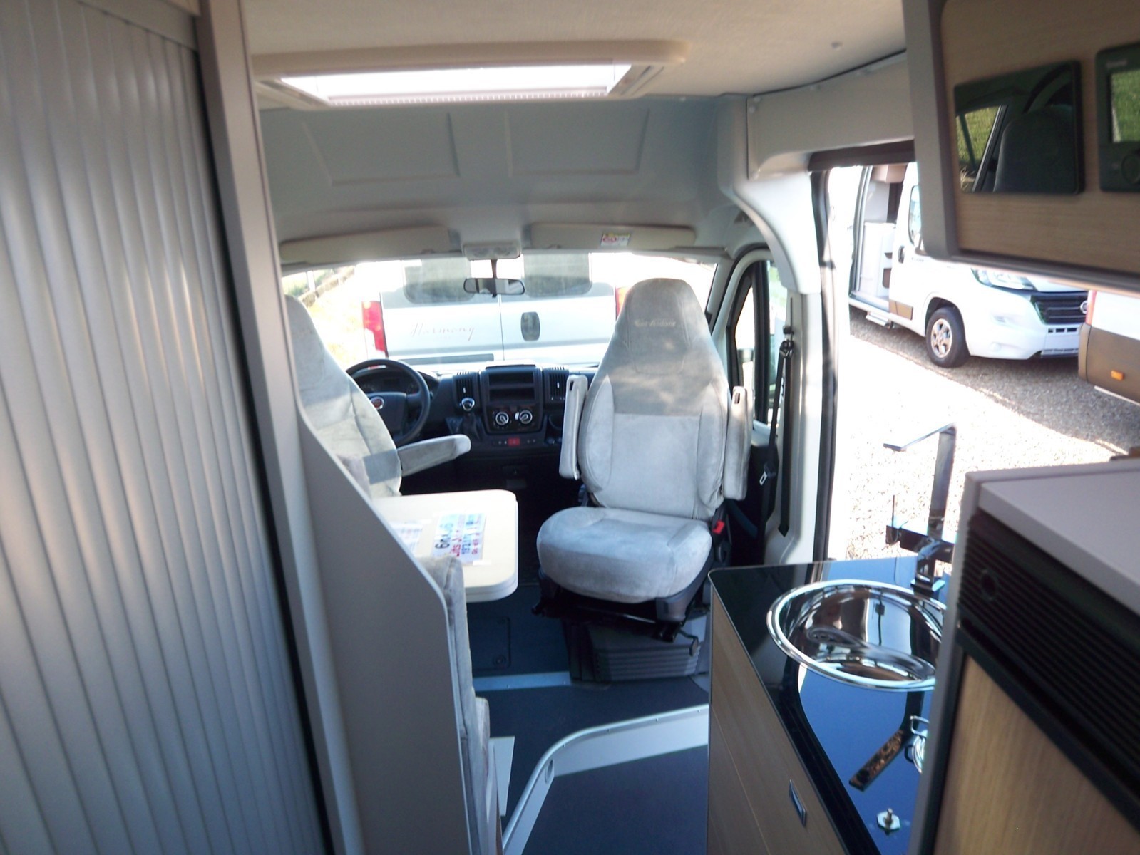 Le porteur Fiat est bien connu, présenté ici avec les sièges rotatifs doté d'accoudoirs, et recouverts de housse amovible au logo Notin. Un autoradio multimedia Kenwood est fourni par le constructeur, et en option nous trouvons un bouton de commande du radar avant, et un interrupteur supplémentaire pour allumer l'autoradio sans mettre le contact.
