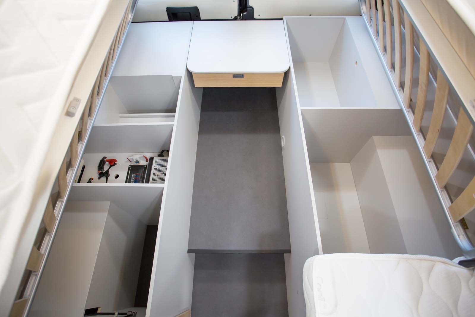 Il en va de même pour l'ensemble électrique (disjoncteur 220 V, chargeur, fusibles cellule et batterie cellule de 110 Ah) dans un compartiment ouvert sur l'extérieur, dont la partie supérieure permet de ranger des chaussures accessibles de l'extérieur et de l'intérieur. Pratique !