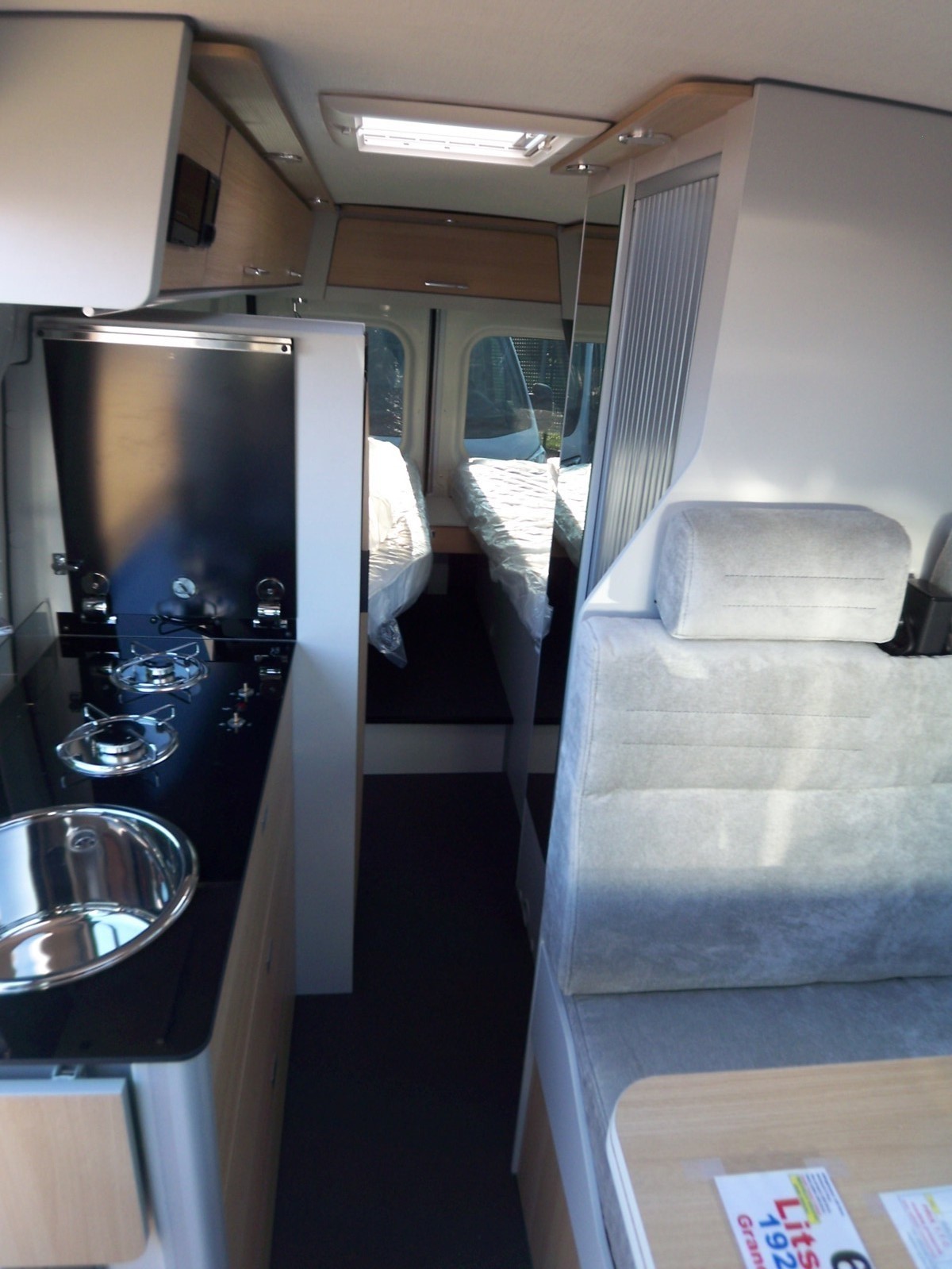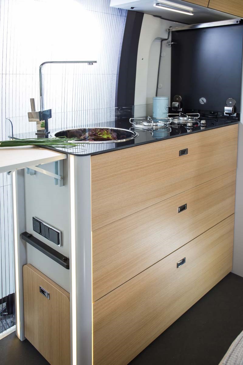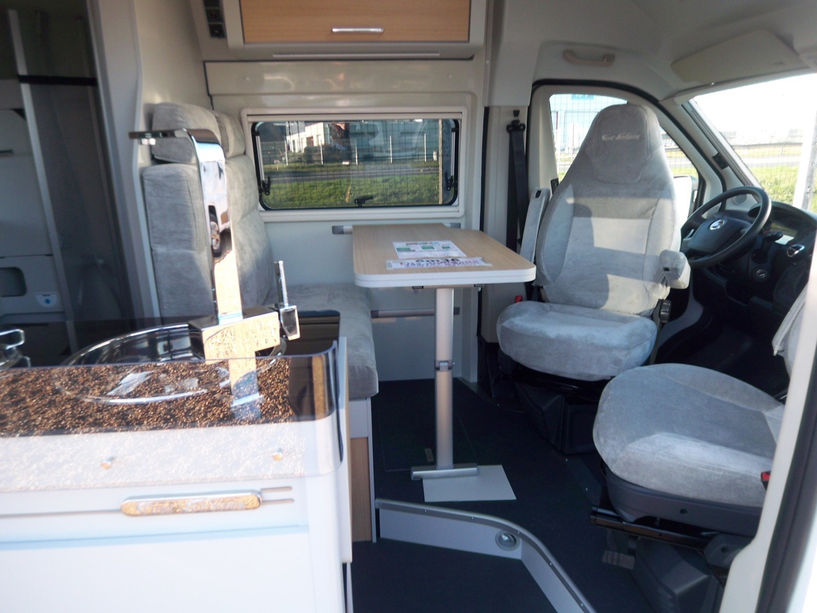 ABS, ASR, ESP, airbags conducteur et passager, rétroviseurs électriques dégivrants, climatisation cabine, skyroof cabine, tapis de sol cabine, hotte aspirante, baies Seitz avec vitres teintées, moustiquaire de porte, support TV 22″, pré-câblage 2 TV et panneau solaire.