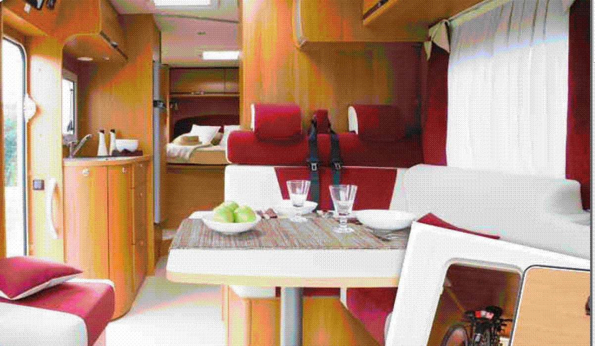 Le mobilier de bonne facture, comporte un salon face-face, une table réglable en tout sens, et un coin cuisine avec un vraie gazinière 3 feux et four. Une hotte d'aspiration placée au dessus s'avère très silencieuse. Le réfrigérateur à absorption avec compartiment conservation trône en face. Une TV Alden et antenne satellite automatique sont en place dans un placard fermé, et le support permet de regarder du salon ou de la chambre pour les amateur de TV.