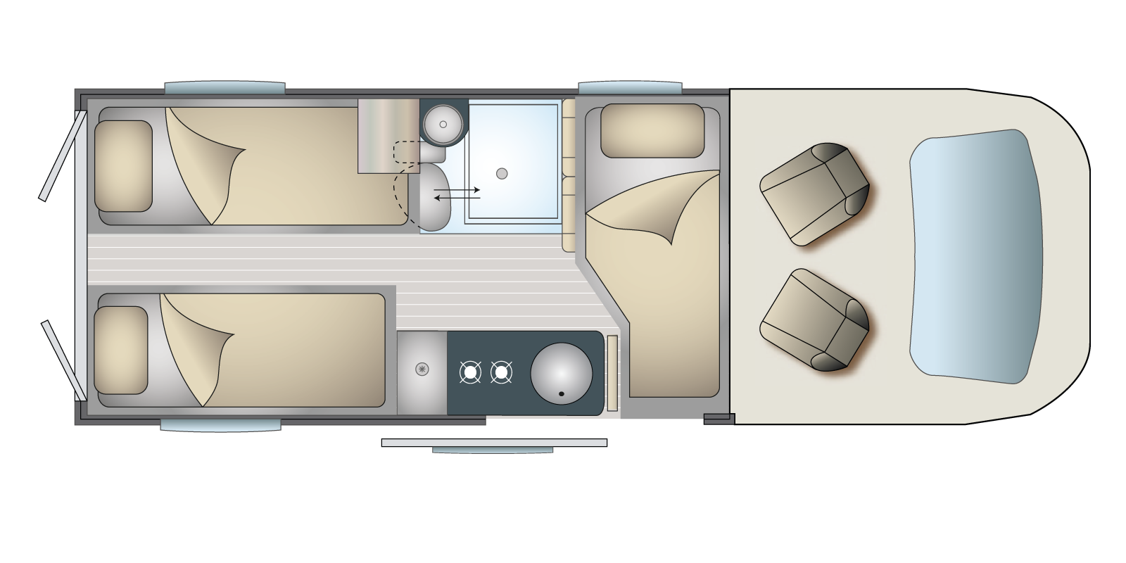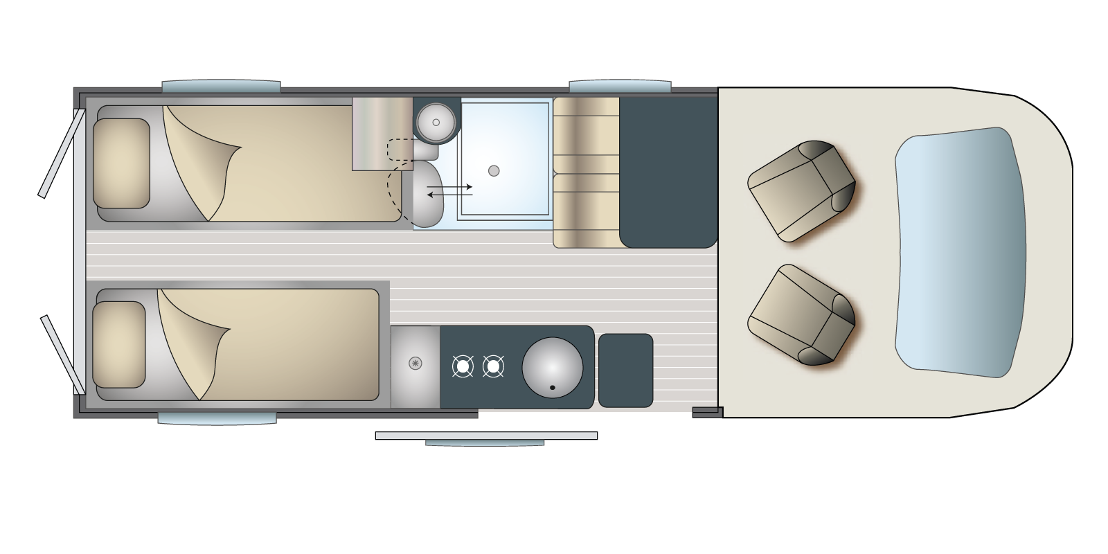 L'emplacement pour les bouteilles de gaz (2x13 kg) est bien accessible, doté en série du système duo et anti-collision qui permet de garder les bouteilles de gaz ouvertes en roulant. Lorsque la bouteille en service est vide, il inverse automatiquement vers la bouteille pleine, sous réserve que les robinets soient ouverts.