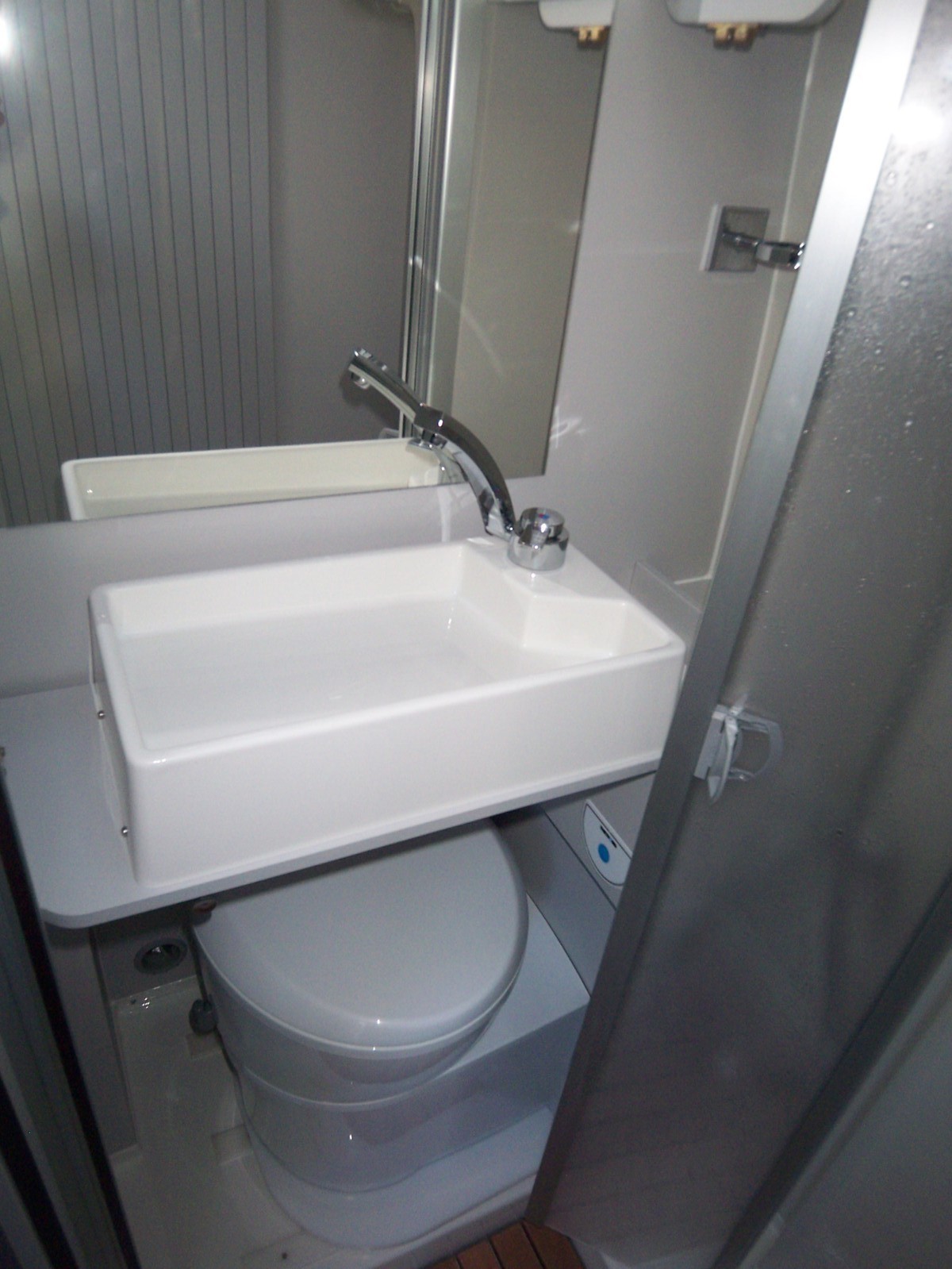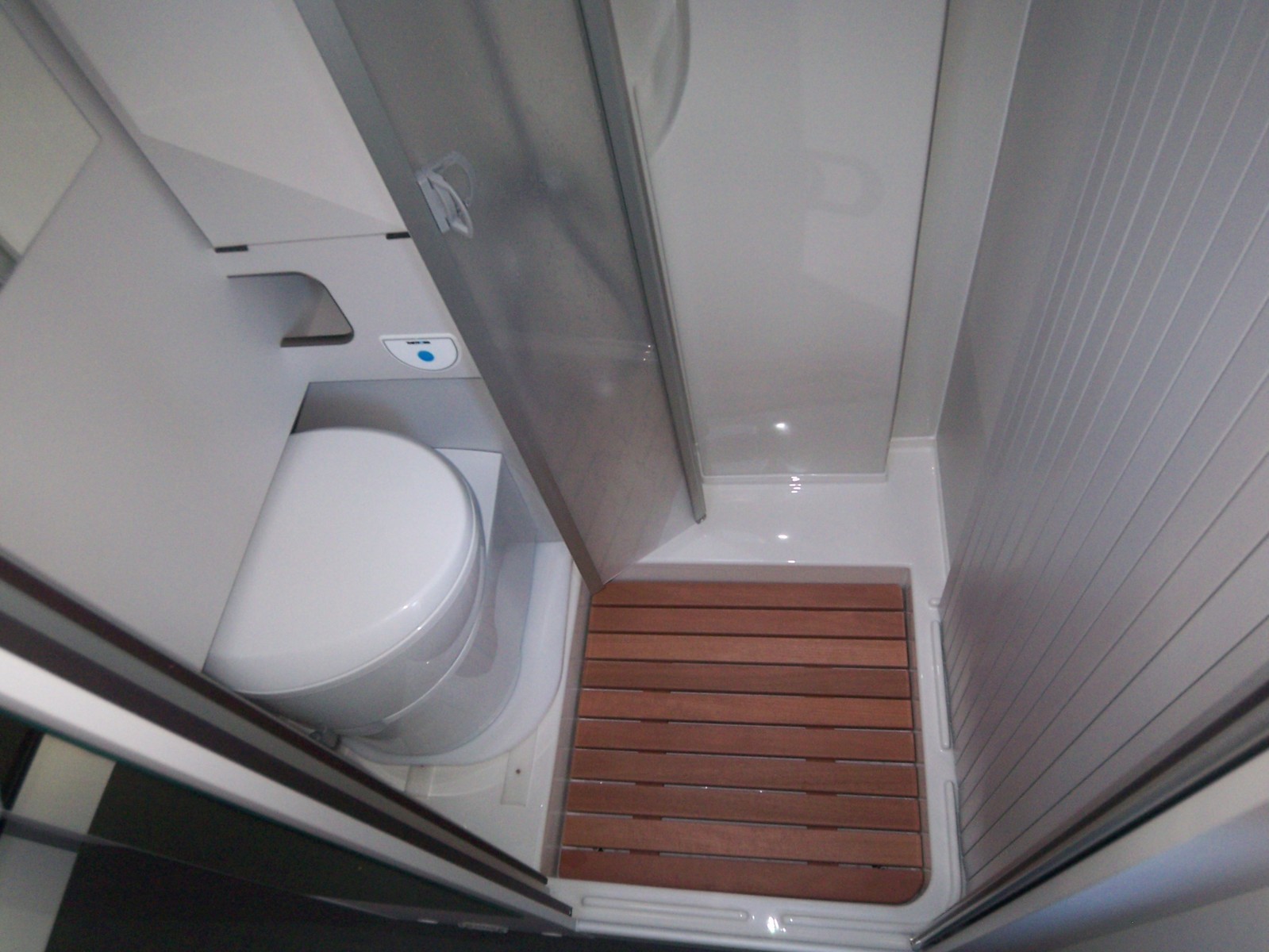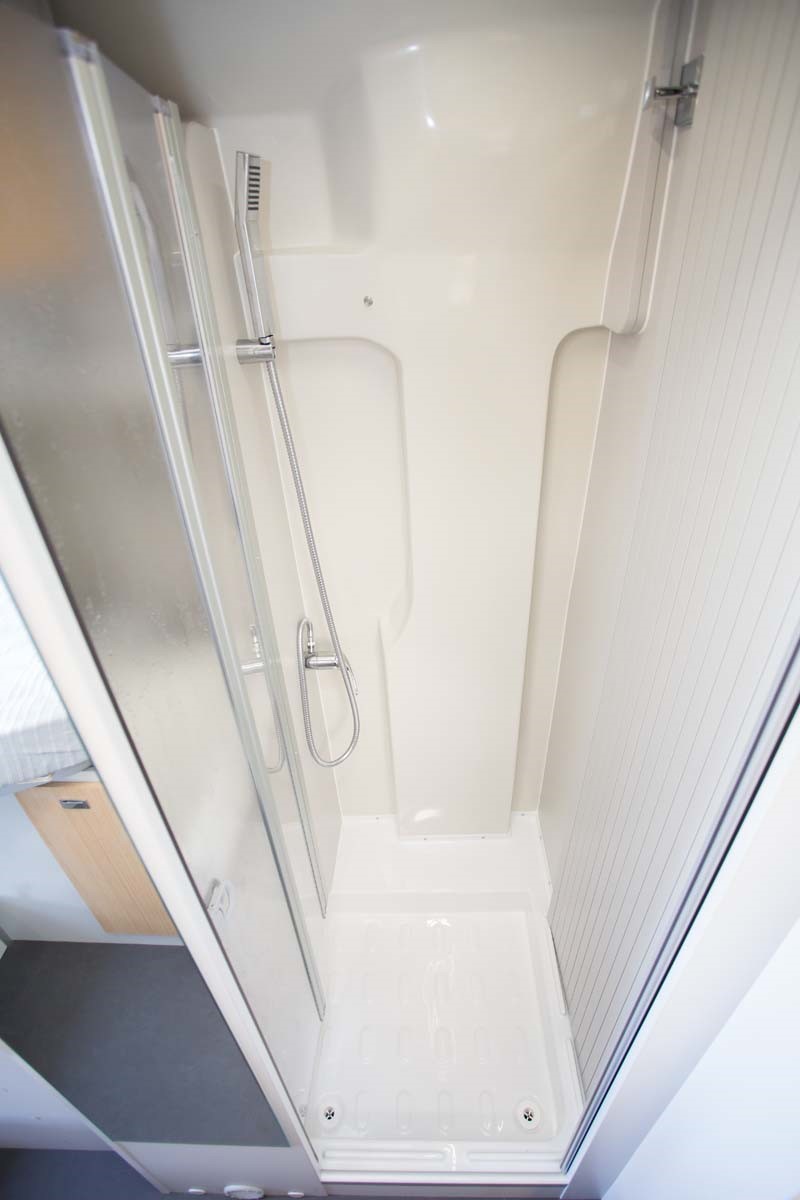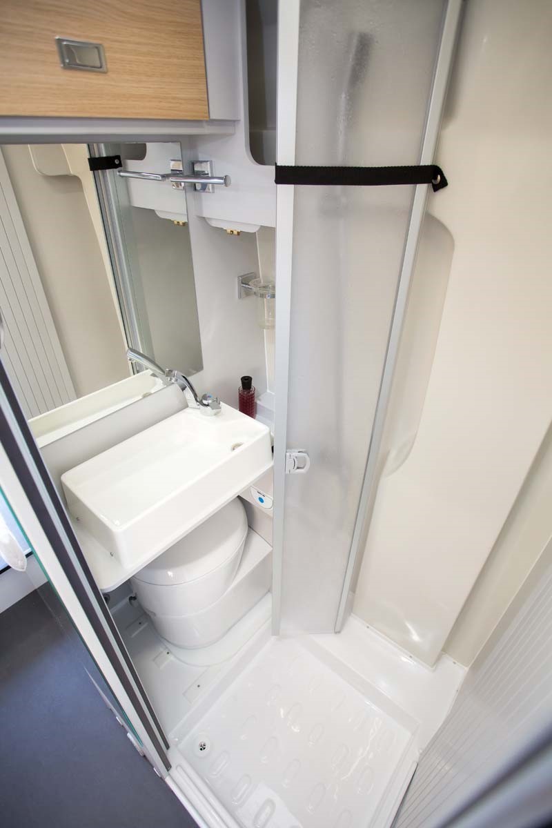 Une porte permet l'accès à la salle de bain qui comporte une douche coté conducteur, des toilettes coté passager, lesquels sont séparées par un sas donnant accès à la chambre, dont il est séparée par un rideau plissé. L'intimité des dormeurs est ainsi assurée qu'il soient dans le lit salon ou dans la chambre. La partie toilette comporte aussi des placards de rangement.