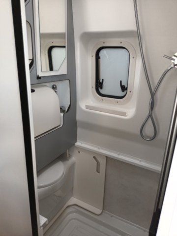 - Une porte permet l'accès à la salle de bain qui comporte une douche, des toilettes rétractables surmontées d'un lavabo relevable. Pas de rideau nylon tous est monobloc et étanche selon le constructeur. La salle de bain est éclairée et ventilée par un lanterneau et une baie. Elle comporte un petit lavabo rabattable au dessus de la cuvette WC mobile qui se range sous un placard, libérant ainsi la place pour une douche de dimensions agréable et fermée par une paroi rigide.