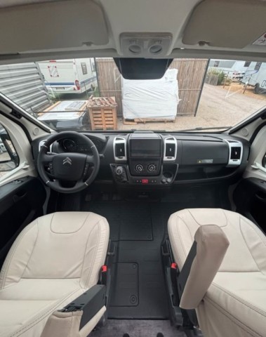 Le porteur Citroën est bien connu, présenté ici avec les sièges rotatifs doté d'accoudoirs, et recouverts de housses amovibles logotées Bavaria. La structure est du type cabine ouverte, ce qui améliore beaucoup la circulation entre salon et cabine, même si l'on y perd quelques rangements.