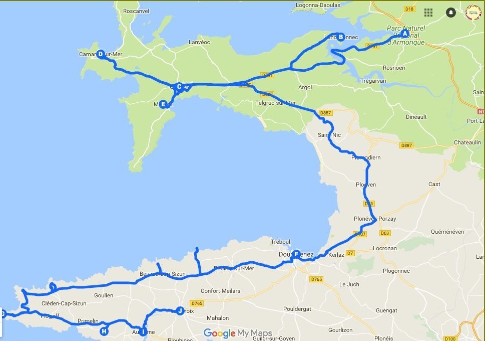 280km, 5 jours: un itinéraire qui commence à Le Faou jusqu'à Camaret-sur-Mer, (appréciez les caps, les pointes, les promontoires, les plages et les ports de la presqu'île de Crozon), puis se poursuit via Locronan et Douarnenez, le long d'une côte magnifiquement découpée, jusqu'au joli village de Pont-Croix.