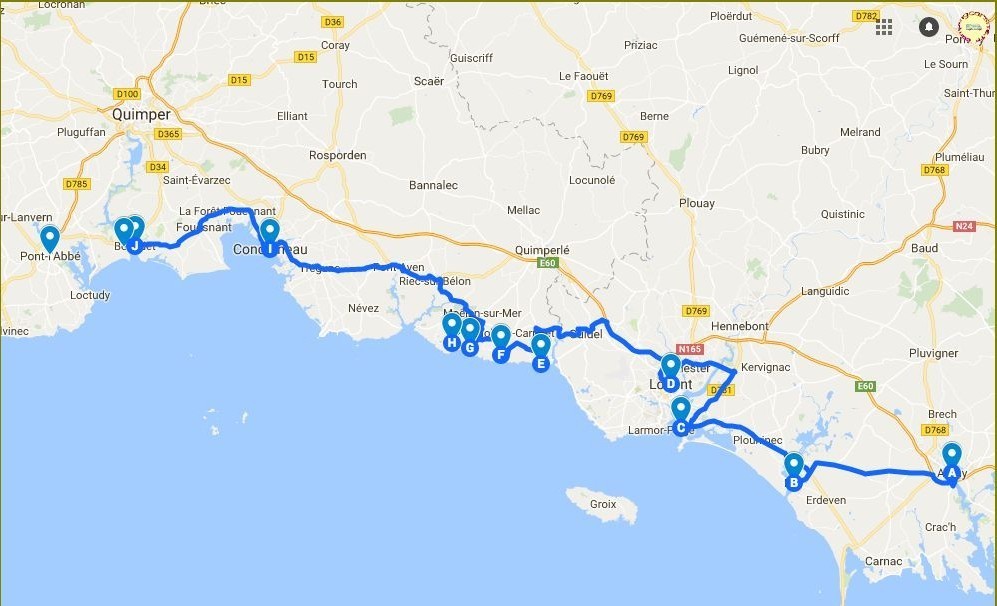 240km, 3 jours: cet itinéraire longe la côte sud de la Bretagne, d'Auray à Pont-l'Abbé. Arrêtez vous sur la ria d'Etel, sur les rives des rias de Doëlan, Merrien et Brigneau.