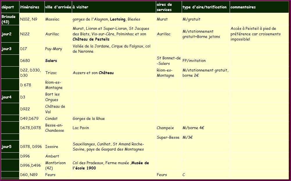 Le tableau ci-dessous propose une base pour un itinéraire de visite. A vous de rajouter des lieux de visites, des étapes conviviales, des lieux de séjour éventuels. Cette base est forcément incomplète et le temps de visite peut augmenter à l'infini...