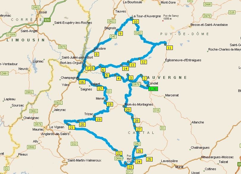 Condat sera notre point de départ après une approche par les routes de la Haute-Loire, ayant décidé de ne pas prendre d'autoroutes. (Il faut bien compenser l'augmentation de la CSG...) Le retour sera organisé de la même façon.