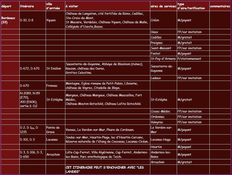 Le tableau ci-dessous propose une base pour un itinéraire de visite. A vous de rajouter des lieux de visites, des étapes conviviales, des lieux de séjour éventuels. Cette base est forcément incomplète et le temps de visite peut augmenter à l'infini...
