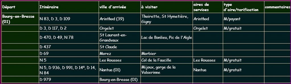 Le tableau ci-dessous propose une base pour un itinéraire de visite. A vous de rajouter des lieux de visites, des étapes conviviales, des lieux de séjour éventuels. Cette base est forcément incomplète et le temps de visite peut augmenter à l'infini...