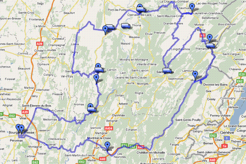 Puis nous commençons la descente des gorges de la Valserine en direction de NANTUA où l'aire de stationnement est saturée, puis BOURG-en-BRESSE.