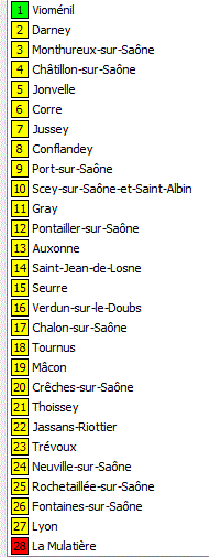 Saône-et-Loire : Verdun-sur-le-Doubs, Chalon-sur-Saône, Tournus, Mâcon, Crèches-sur-Saône ;