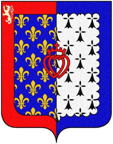 mi-parti, au premier d'azur semé de fleurs de lys d'or à la bordure de gueules chargée en franc-canton d'un lion d'argent, au second d'hermine à la bordure ondée d'azur ; au double cœur vidé, couronné et croiseté de gueules, mis en abîme et brochant sur le tout